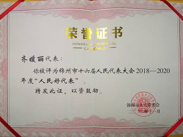人大代表齐嫒丽荣获“锦州市人民好代表”荣誉称号
