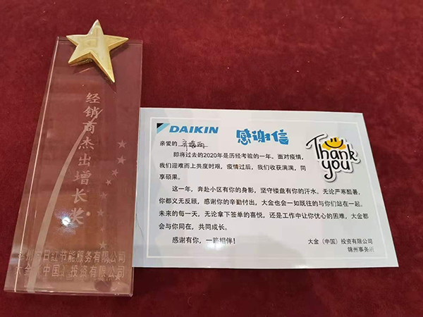 2020年11月26日,大金(中国)中央空调2020年终经销商总结表彰大会在阜新举行,来自全省XXX家大金经销商齐聚一堂,回顾过去,展望未来,共同探讨面对疫情如何经营、如何发展。会上,大金公司对过去一年表现突出的经销商和个人进行表彰,公司荣获经销商杰出增长奖、部门经理田野荣获销售新星、销售达人奖。
